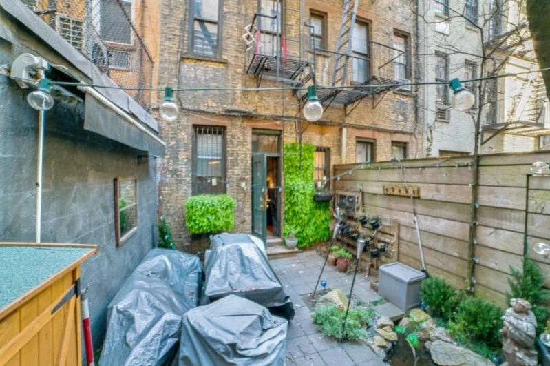 1st floor unit with 2 stairs into the building, the backyard is enclosed by a 10 foot wall on the southern side and hardwoods on the eastern and western side which complete the privacy. There is a storage shed in the backyard and there is complimentary patio furniture included in the yard for your personal use anytime.