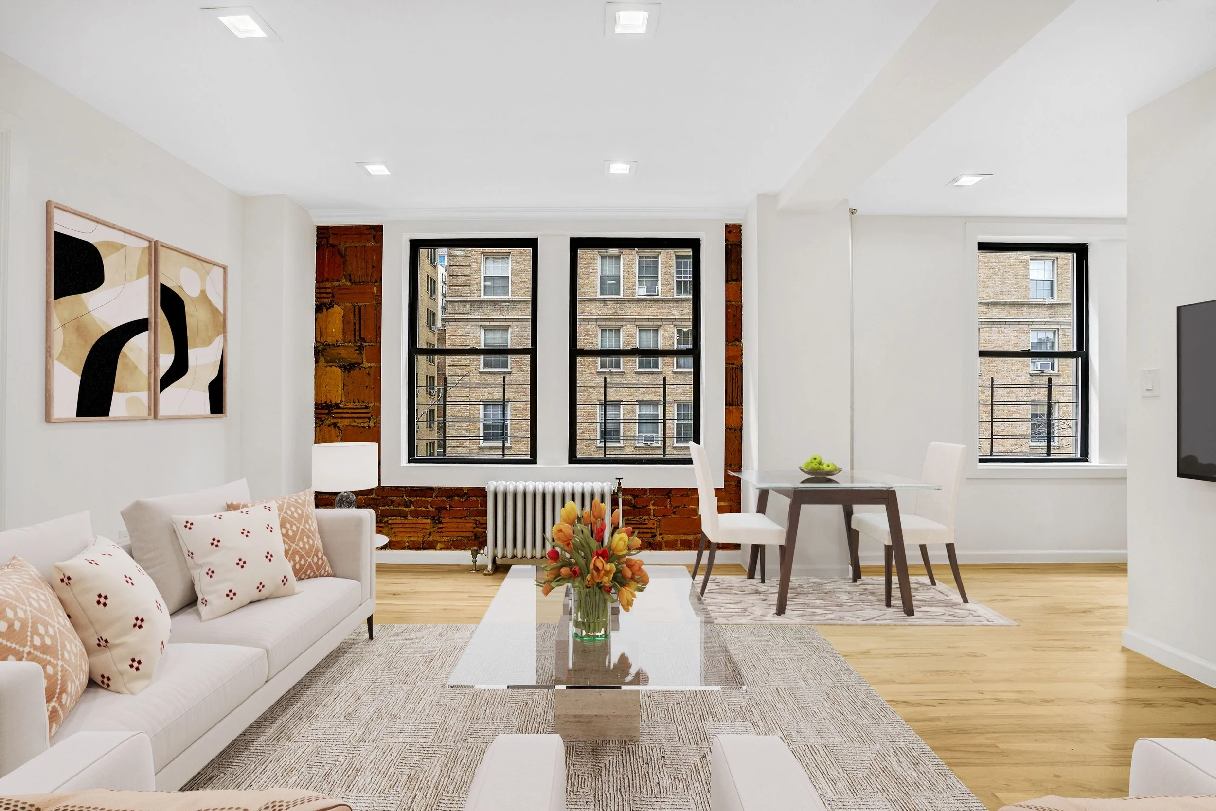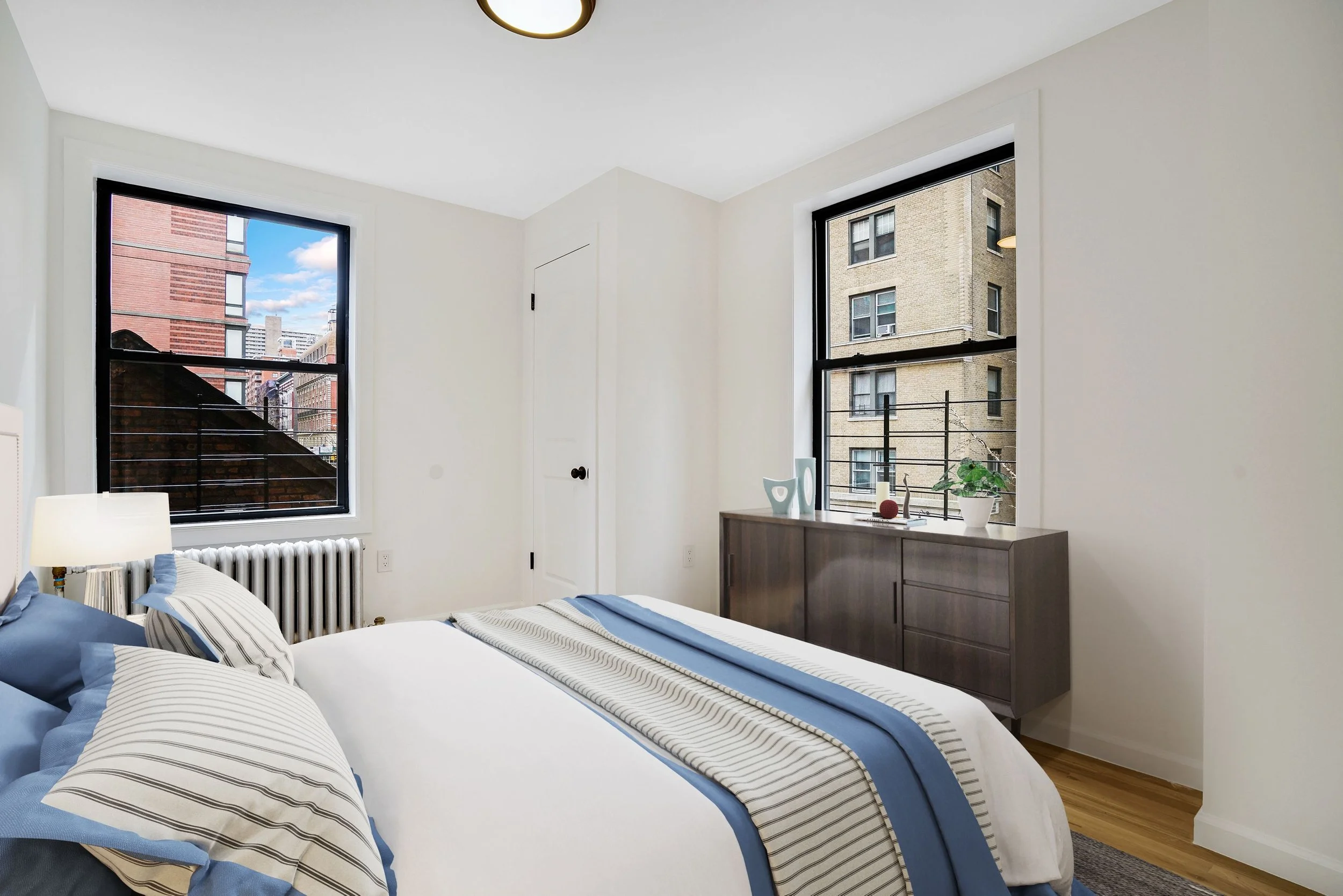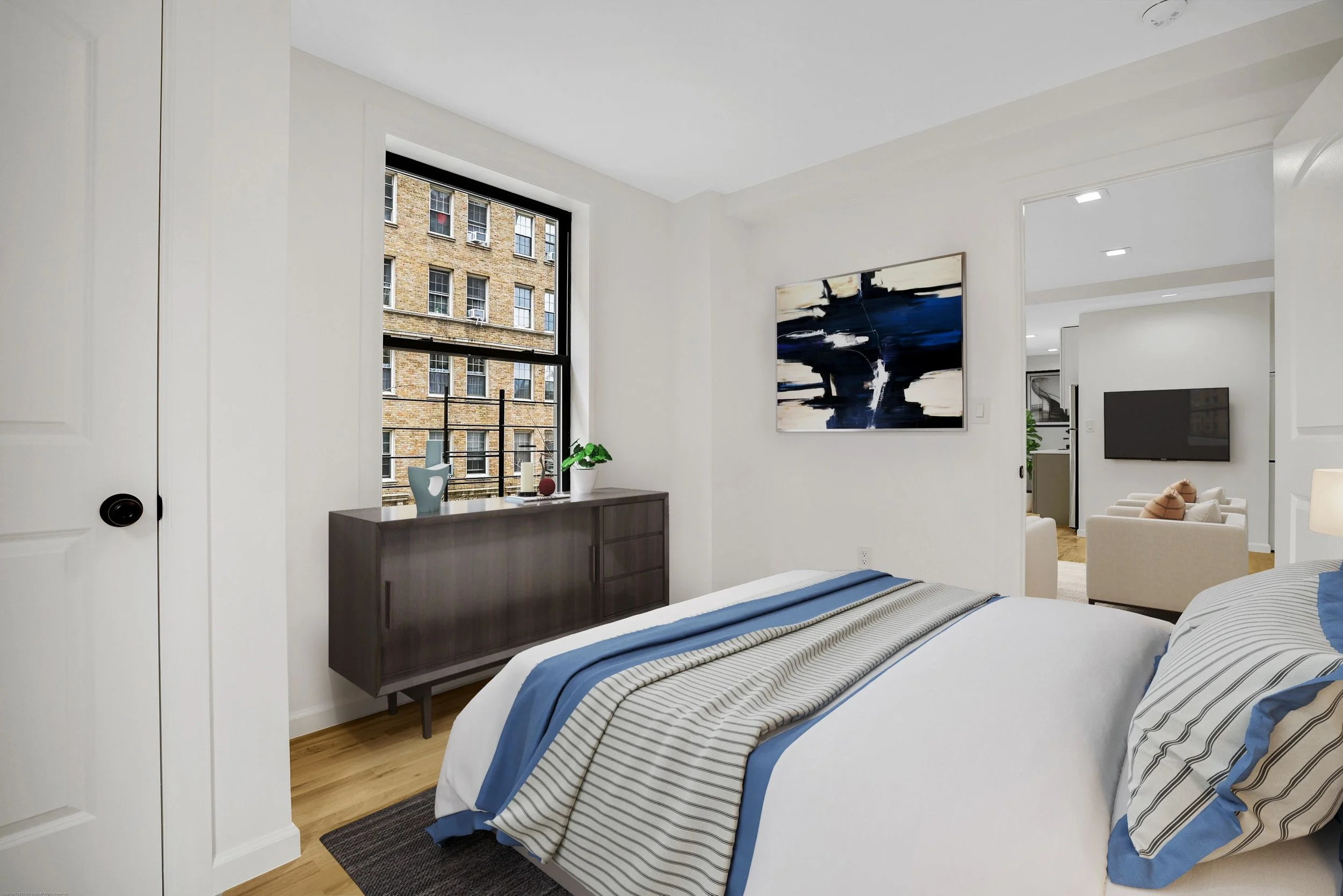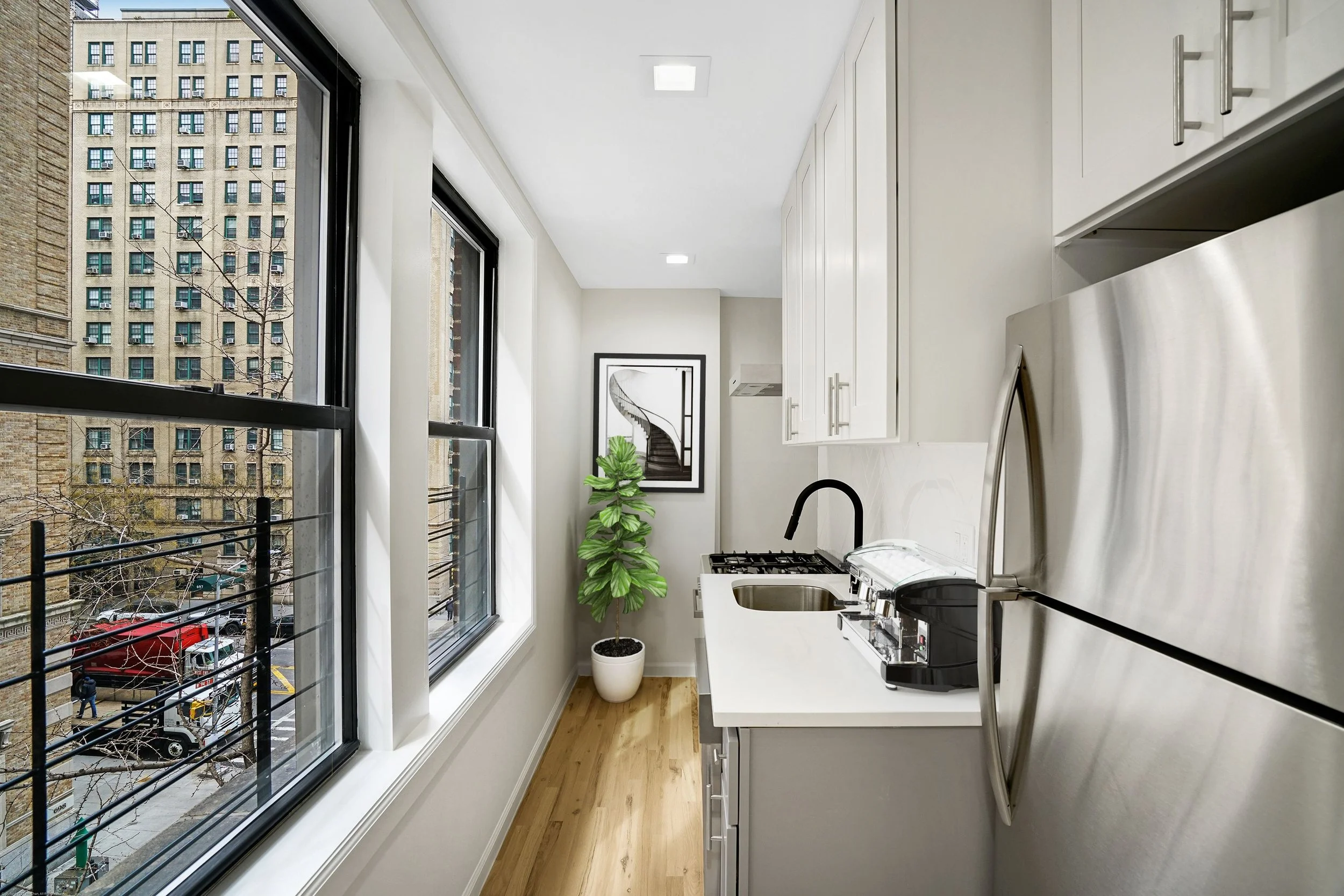 This is a lovely, fully renovated, never been lived in, 2 bedroom home with 2 full sized bathrooms. Both fabulously designed bathrooms are easily accessible at anytime from the living room. The unit boasts a very good sized living room with a massive wall of south facing windows. In fact, there are south facing windows in every room, with the exception of one bedroom which has unobstructed East sun! The kitchen has full sized stainless steel appliances and includes full sized fridge, stove, dishwasher and hood for cooking! The kitchen is also bathed in south sunlight and would be a glorious place to enjoy a cup of coffee in the morning. There is a storage closet/nook in the kitchen for all of your non essentials. The unit has been given a full electrical upgrade which now supports a full washer dryer stack for your ease and comfort. The building has an elevator as well as a service elevator for moving in and out. There is a laundry room, an on-site super, and a virtual doorman system for guest and package entry from the comfort of an app on your phone. Pets are welcome on a case by case scenario. The Riverside is located just behind the famous and serene Pomander Walk and the Peter Jay Tharp Theater Symphony Space. 1/2 block to the express subway and every possible shopping destination you could need. The proximity to both parks complete this perfect find.